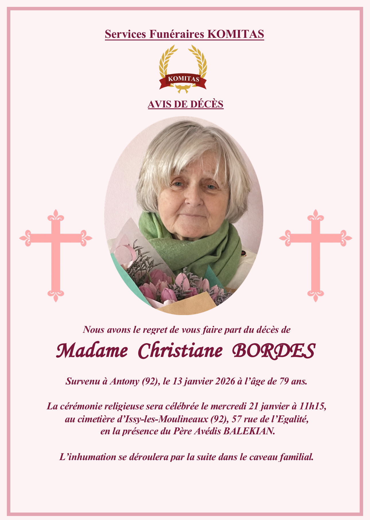C’est avec une grande tristesse que nous vous annonçons le décès de Christiane BORDES survenu le mardi 13 janvier 2026 à Antony. La cérémonie se déroulera le mercredi 21 janvier 2026 à 11h15 à l’adresse suivante : Cimetière - 57, Rue de l'Égalité - 92130 Issy-les-Moulineaux.